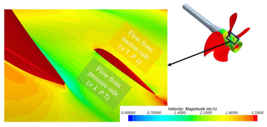 Figure 16 shows velocity distribution in the 0.2 r/R plane around overall the propeller structure. It was confirmed that the flow with low velocity and high pressure from the pressure side flowed along the left side of the PBCF fin. Meanwhile, the flow with high velocity and low pressure flowed along the right side of the PBCF fin. As a result, the net force was generated by the pressure difference between both sides of the PBCF fin. This force could be induced in the same direction as rotating direction of the propeller when the fins were properly arranged. This meant that, the propeller had additional rotating force by PBCF fins so that the torque of the propeller was decreased.