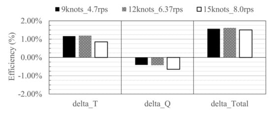 Figure 22 shows rates of change of full-scale self-propulsion factors due to PBCF at each ship speed. In simulation, as shown in Figure 22a, the changes by PBCF were relatively consistent according to ship speed like results in Figure 20a. In addition, torque reduction of about 1.5% at the self-propulsion point caused 1.5% reduction in and On the contrary, in the experiment, since the changes of the propulsion performance by PBCF at the self-propulsion point was inconsistent according to ship speed, the changes in self-propulsion efficiency were not completely consistent also. Nonetheless, most of self-propulsion efficiencies increased except for that at 9 knots by PBCF in experiment. However, the large difference of the wake coefficient in the experiment indicated some instability of the experiment. This was because the flow change in front of the propeller by PBCF was not obvious from a common sense. One important feature was that changes of propeller open water efficiency by PBCF in both the experiment and simulation were very similar, showing an average of 0.7%. This rate of change of was also similar to results of the POW test.