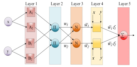 In the common ANFIS workflow, as drawn in Figure 1, x and y represent the inputs of Layer 1, where indicates the outputs of the i node. The ANFIS mathematical model is expressed as follows: