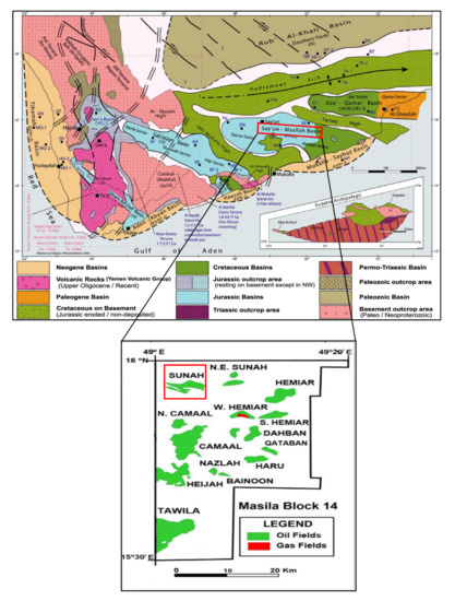 - Hakimi, M.H.; Al Qadasi, B.A.; Al Sharrabi, Y.; Al Sorore, O.T.; Al Samet, N.G. Petrophysical properties of Cretaceous clastic rocks (Qishn Formation) in the Sharyoof oilfield, onshore Masila Basin, Yemen. Egypt. J. Pet. 2017, 26, 439–455. [Google Scholar] [CrossRef] [Green Version]