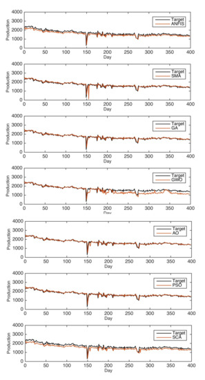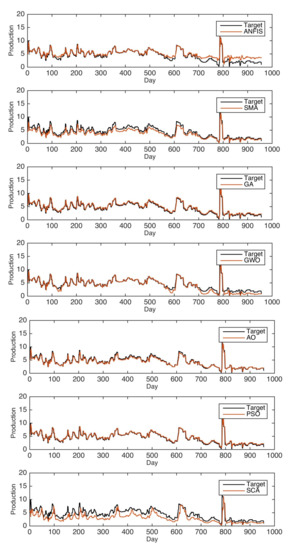 Furthermore, Figure 6 shows the prediction results of the AO-ANFIS against the compared model. As noticed from this figure, AO-ANFIS achieved the nearest values to the target data.