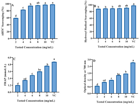 Antioxidant effects of HCEO and positive VC in vitro. Values are expressed as means ± SD (n = 10). (A) ABTS+ scavenging activity of HCEO compared with VC (2 mg/mL); (B) OH• scavenging activity of HCEO compared with VC (2 mg/mL); (C) Ferric-reducing antioxidant power (FRAP) of HCEO compared with VC (2 mg/mL); (D) Reducing power of HCEO compared with VC (2 mg/mL). Different letters (a, b, c, d) indicate that the difference is significant (p < 0.05).