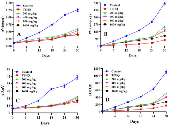 The influences of HCEO on AV (A), PV (B), ρ-AnV (C) and TOTOX (D) of sunflower oil samples during the accelerated storage. Values are expressed as means ± SD (n = 10). (Control) sunflower oil added with nothing. (TBHQ) sunflower oil added with TBHQ at 200 mg/kg, (200 mg/kg) sunflower oil added with HCEO at 200 mg/kg, (400 mg/kg) sunflower oil added with HCEO at 400 mg/kg, (800 mg/kg) sunflower oil added with HCEO at 800 mg/kg, (1600 mg/kg) sunflower oil added with HCEO at 1600 mg/kg. AV, acid value, PV, peroxide value, ρ-AnV, ρ-anisidine value, TOTOX, Total oxidation value.