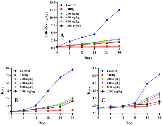 Conjugated diene and conjugated triene could be generated during vegetable oil oxidation, and they can be evaluated by the OD determined at 232 nm (K232) and 268 nm (K268), respectively [34]. As exhibited in Figure 3, during the storage at 65 °C, the values for K232 and K268 of the control group sharply rose in the control sample. HCEO at 1600 mg/kg could obviously inhibit the increase in K232 and K268 to 22.5 and 3.3 on the 30th day (p < 0.01). The results in TBARS, K232 and K268 described that HCEO at 1600 mg/kg was able to restrict the generation of MDA, conjugated diene and conjugated triene in sunflower oil during the accelerated storage. In consequence, HCEO could effectively retard the lipid degradation and ameliorate the oxidative stability of sunflower oil samples, which was in agreement with our previous study results [15].