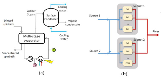 The network is composed of fifteen evaporation plants (EV) which should be able to regenerate five different acid baths, called products (P) hereinafter. Each plant includes a variety of equipment as well (multi-stage evaporators and heat-exchangers plus a cooling condenser, see Figure 1a), and each component has its nominal capacity, that varies from one to another. Although the efficiency of each plant depends on different factors, the two main ones are:
