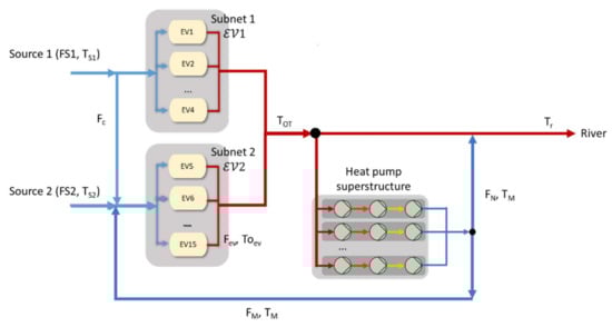 Finally, the only question that remains open is how the HPs should be incorporated into the actual network layout, regarding what to do with the outlet flow from the HPs section. For most scenarios, the suggestion for such a flow is complete recirculation to the inlet of Subnet 2. Nonetheless, when the inlet temperature from the sources is quite high, or in the hypothetical cases where the maximum temperature allowed by the environmental regulation (MTO) decreases, the computed results suggest recirculating only part of the flow as the most beneficial course of action. The remaining part will join the water going to the river. Therefore, the optimal installation design is to incorporate a flow control valve at the outlet of the HPs section, able to modify the flow that goes each way, i.e., the values of FM and FN in Figure 2.