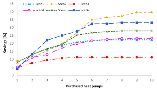 Savings percentage according to the purchased heat pumps for each scenario.