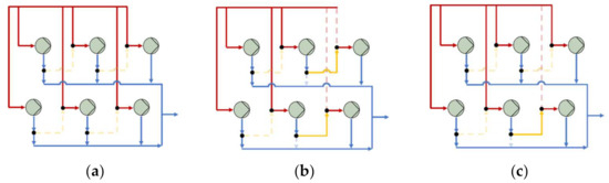 Installation layout according to the different scenarios: (a) All the heat pumps connected in series; (b) Four heat pumps connected in parallel, two in series; (c) Five heat pumps connected in parallel, one in series. Note that the dashed lines indicate existing connection but not used in the scenario. The yellow lines indicate the outlet flow from a heat pump which is used as inlet for another (serial connection).