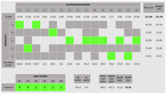 Designed HMI interface. Columns represent the evaporation plants. The first row indicates the evaporation load in t/h. The next five rows correspond to the products and the last one displays the cooling water to each SC. Current load assignation arises in the green boxes. Dark gray boxes indicate forbidden connections.