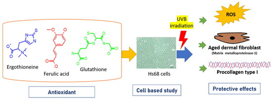 Ergothioneine (ERG, 2-mercaptohistidine trimethylbetaine) is a naturally occurring amino acid that is a thiourea derivative of histidine and contains a sulfur atom on the imidazole ring and trimethylated amine [11]. Many studies have reported ERG to be a potential ingredient in anti-photoaging cosmetic products for its ability to inhibit the expression of the MMP-1 protein and for its anti-inflammatory properties in dermal fibroblasts upon UV irradiation [12]. The human body cannot produce ergothioneine on its own, so it needs to be taken from the diet. ERG has been shown to protect cells from UV-induced ROS production, is more powerful than CoQ10 in preventing lipid peroxidation, and is better than idebenone in directly scavenging peroxide [13]. ERG not only prevents oxidative damage, but may also enable DNA repair after the UV irradiation of cells [14,15]. Glutathione (GSH, γ-L-Glutamyl-L-cysteinyl-glycine) is a health dietary supplement used in several countries, including the Philippines, Malaysia, Japan, Taiwan, and Thailand [16]. Some studies have shown that glutathione is involved in melanogenesis via mechanisms associated with pheomelanin synthesis, which allows glutathione to act as a whitening agent in certain cosmetic products [17]. Ferulic acid (FA, 4-hydroxy-3-methoxycinnamic acid) is a phenolic compound found in cereal brans, popcorn, artichokes, and some vegetables. FA has shown antidiabetic, antioxidant, antimicrobial, anti-wrinkle, and whitening properties [18,19,20,21]. An FA treatment group demonstrated the inhibition of UVB-induced cytotoxicity and apoptosis [22]. In addition, FA has been used as a photoprotective agent in many skin products such as lotions and sunscreens. In vitro and in vivo experiments may be successfully employing FA as topical protective agents against UV radiation-induced skin damage [23]. L-ascorbic acid and α-tocopherol are able to stabilize FA, thus endowing cells with dual protection against photoaging and skin cancer [24,25].