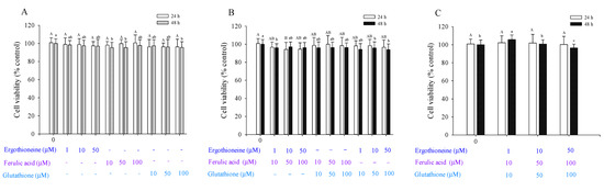 Viability of Hs68 cells after 24 h and 48 h in the presence of a single antioxidant (A), combination of two antioxidants (B), and combination of three antioxidants (C), namely ergothioneine, ferulic acid, and glutathione. Each value is expressed as the mean ± SD (n ≥ 3). Different letters indicate significant differences among treatments (p < 0.05).
