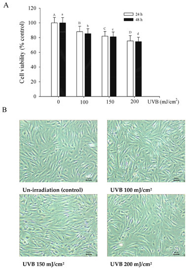 Viability of Hs68 cells for 24 h or 48 h after exposure to UVB at different irradiation dosages (A). Cell image of Hs68 cells for 24 h after exposure to UVB at different irradiation dosages (B). Each value is expressed as the mean ± SD (n ≥ 3). Different letters indicate significant differences among treatments (p < 0.05).