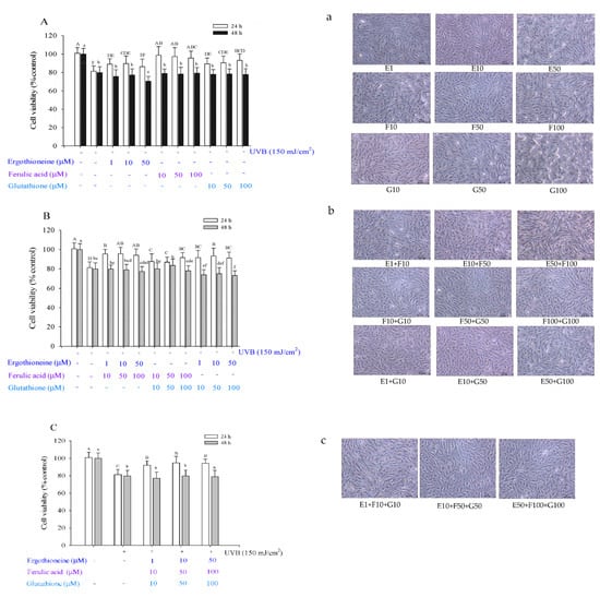 Viability of Hs68 cells after UVB irradiation for 24 or 48 h in the presence of a single (A), combination of two (B), or combination of three types of antioxidants (C), namely ergothioneine, ferulic acid, and glutathione. Effects of ergothioneine, ferulic acid, and glutathione on the cell image of Hs68 cells after UVB irradiation at 150 mJ/cm2 for 24 h, in the presence of a single (a), combination of two (b), or combination of three types of antioxidants (c). Each value is expressed as the mean ± SD (n ≥ 3). Different letters indicate significant differences among treatments (p < 0.05).