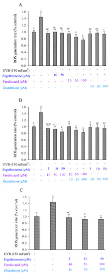 ROS production in Hs68 cells induced by UVB irradiation in the presence of a single (A), combination of two (B), or combination of three types of antioxidants (C), namely ergothioneine, ferulic acid, and glutathione. Each value is expressed as the mean ± SD (n ≥ 3). Different letters indicate significant differences among treatments (p < 0.05).