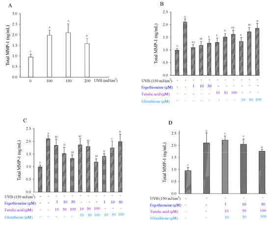 Total MMP-1 production by Hs68 cells after exposure to UVB at various irradiation dosages (A). Total MMP-1 production by Hs68 cells induced by UVB irradiation in the presence of a single (B), combination of two (C), or combination of three types of antioxidants (D), namely ergothioneine, ferulic acid, and glutathione. Each value is expressed as the mean ± SD (n ≥ 3). Different letters indicate significant differences among treatments (p < 0.05).