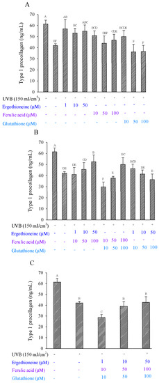 Type 1 procollagen production of Hs68 cells induced by UVB irradiation in the presence of a single (A), combination of two (B), or combination of three types of antioxidants (C), namely ergothioneine, ferulic acid, and glutathione. Each value is expressed as the mean ± SD (n ≥ 3). Different letters indicate significant differences among treatments (p < 0.05).