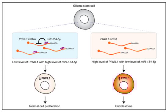 An axis of the miRNA and PIWI pathway in malignant glioblastoma. PIWIL1 is expressed at higher levels in glioma stem cells compared to non-glioma stem cells and localized in the cytoplasm []. Downregulated PIWIL1 by miRNA-154-5p (miR-154-5p) inhibits malignant behavior of glioblastoma, while upregulated PIWIL1 in the lack of miR-154-5p leads to malignant glioblastoma [].