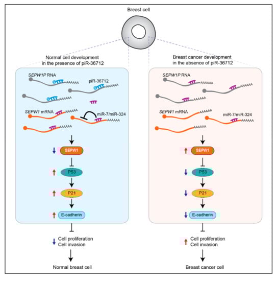 A tumor-suppressing piRNA in breast cancer. Left, piR-36712 binds and destabilizes SEPW1P RNA, a SEPW1 pseudogene, which inhibits SEPW1 expression by reducing SEPW1P levels. It increases P53, P21, and E-cadherin levels, and consequently, suppresses cancer development. Right, when piR-36712 is downregulated in breast cells, SEPW1 is highly expressed, and P53, P21, and E-cadherin levels are suppressed, which promotes breast cancer development [].