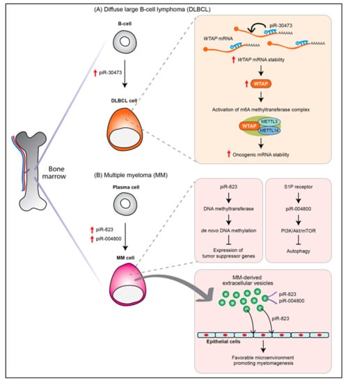 Oncogenic piRNAs in blood cancer. (A) piR-30473 promotes the progression of diffuse large B-cell lymphoma (DLBCL) by regulating N6-methyladenosine (m6A) posttranscriptional RNA modification [,]. (B) piR-823 and piR-004800 promote the progression of multiple myeloma (MM) and are found in MM-derived extracellular vesicles [,,]. The encapsulated piR-823 is released to endothelial cells and leads to establish a favorable microenvironment that ultimately promotes myelomagenesis [].