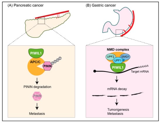 piRNA-independent regulation of PIWI protein. (A) In pancreatic cancer, unloaded PIWIL1 interacts with the anaphase-promoting complex/cyclosome (APC/C) E3 complex and acts as a co-activator to target a cell adhesion-related protein, PININ []. (B) In gastric cancer, unloaded PIWIL1 degrades many target RNAs via the recruitment of UPF1-mediated nonsense-mediated mRNA decay (NMD) components [].