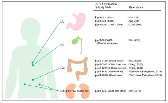 piRNAs have been suggested to be promising tissue-based biomarkers for cancer diagnosis and prognosis as their expression changes are associated with cancer development and progression. piRNAs are also suggested to be non-invasive biomarkers since they are present in human body fluids such as blood, saliva, gastric juice, and urine (Figure 5) [,,,,,,]. Fortunately, piRNAs are present in human serum and plasma samples and remain stable even after repetitive freeze-thaw cycles or long-term incubation at room temperature []. Such stability might be owing to the 2′-O-methyl modification in piRNAs by likely protecting them from 3′ uridylation and truncation, which are considered to influence small RNA stability [,]. Another, but not mutually exclusive possibility, is that piRNAs in the blood are encapsulated into the extracellular vesicles like microvesicles and exosomes, so they can be protected from ribonuclease digestions. We have mentioned above that piR-823 and piR-004800 are found in multiple myeloma-derived extracellular vesicles and such encapsulated piR-823 is released to establish a favorable tumor microenvironment [,,].