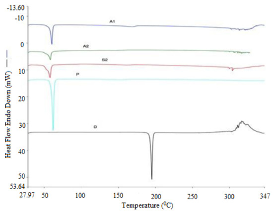 The DSC spectra of pure Gef and various SDs prepared using fusion method are presented in Figure 1. The pure Gef showed a sharp endothermic melting peak at 198 °C, which corresponds to its melting point. The prepared SDs A1 and A2 (with Kollidon), S2 (Soluplus), and P (PEG 4000) showed a large shift of melting point from 198 °C to 52–55 °C. This shifting of the peak was possible due to the complete solubility of Gef in the used carrier system. The crystalline Gef converted to amorphous state after solubilization in the carrier. In the case of formulation P prepared with PEG 4000, a sharp large peak at 54 °C was recorded, which corresponds to its melting temperature. The formulations (A1 and A2) prepared using Kollidon and PEG 4000 showed an endothermic peak at 52 °C; there was slight difference in the peak height between both formulations. The change in carrier led to differences in the peak heights of the formulations.