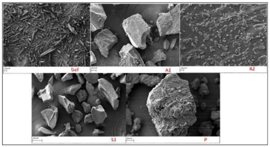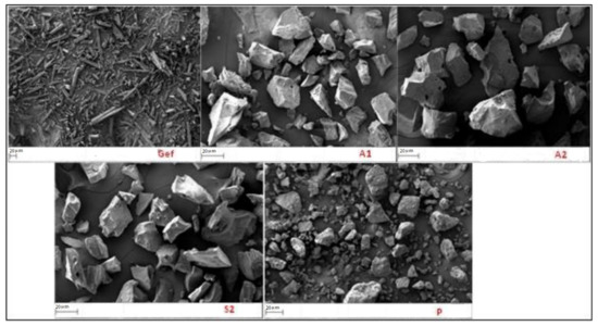 The SEM images for pure Gef and various SDs prepared using microwave method are presented in Figure 4. The surface morphology of the pure Gef was found to be a well-defined crystal structure with sharp acicular structure. The microwave irradiated formulations (A1, A2, and S2) showed significant changes in the surface morphology. The particles were converted to amorphous structure, which was further confirmed with the PXRD and DSC study. The formulation (P) prepared with PEG 4000 showed greater changes in the structure. The particle showed an amorphous structure with irregular rough surface. The change in the particles shape confirms the formation of SD and the crystalline Gef completely solubilized in the used carrier PEG 4000 [10].