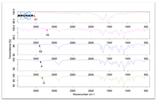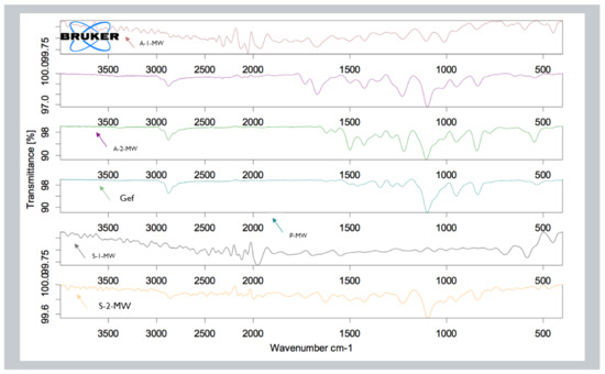 The FTIR spectra for pure Gef and various SDs prepared using microwave method are presented in Figure 6. The FTIR spectra of pure Gef exhibited various spectral peaks for the existing functional groups. The prepared SD (P) showed similar peaks as that of pure Gef with slight variation. The peaks for NH were observed with a slight variation in the peak at 3400 cm−1 for NH groups. The peaks for the alkyl group also exhibited a slight variation at 2808 cm−1 compared to the pure Gef. The peak for C=N group was not observed in the carrier P. The peaks for C=C aryl group, C-O group, and C-F group were also observed at 1500, 1110, and 962 cm−1 as compared to the pure Gef. The other formulation (S2) exhibited slight variation for the NH group at 3401 cm−1, whereas formulation S1 exhibited a sharp change in the NH peak at 3448 cm−1 as compared to the pure Gef. The formulation (S2) also exhibited a peak for CH2 group at 2890 cm−1 but S1 exhibited the absence of peaks for NH group as compared to the pure Gef. The peaks for C=N group exhibited a drastic change for the formulation S2 at 1675 and S1 at 1637 cm−1 in compliance with the pure Gef. The spectra exhibited an absence of peaks for aryl and C-O group for both the formulations. The formulation S2 exhibited a peak for C-F group at 961 cm−1 but the spectra of S1 exhibited no traces for the peaks of C-F group as compared with the pure Gef. The other SDs (A1 and A2) showed peaks in compliance with the pure Gef with the absence of peaks for C=C group at 1500 cm−1. The above FTIR spectral peaks conclude that the main characteristics peaks were present in the formulation as compared to the pure Gef with slight deviation. The change in the peaks was due to the presence of carrier peaks and formation of SD. The spectra also indicated a minimal interaction between the functional groups of the pure Gef and the PEG 4000, Soluplus, and Kollidon [10].