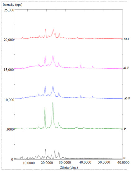 The PXRD spectra for pure Gef and various SDs prepared using fusion method are presented in Figure 7. The changes in the PXRD spectra of the pure Gef were evaluated after preparing the SD with different carriers. The pure Gef showed multiple, sharp high-intensity diffraction peaks at 19.3°, 24.1°, and 26.4°, which revealed the existence of its natural crystalline form. The different carriers like Kollidon (38.1° and 43.2°), PEG 4000 (18.7° and 21.5°), and Soluplus (38.1° and 42.1°) showed their characteristic diffraction peaks at respective 2 theta values. The prepared formulations (P, S1, S2, and A2) showed significant changes in the high intensity peaks of Gef. The peak height and intensity were reduced due to the conversion of crystalline Gef into amorphous state after being completely dispersed into the used hydrophilic carrier. The other observed peaks in the formulations were of the used carriers [10].