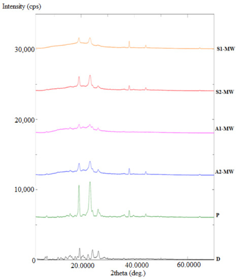 The PXRD spectra for pure Gef and various SDs prepared using microwave method are presented in Figure 8. The pure Gef showed multiple, sharp, high-intensity diffraction peaks at various diffraction angles. The different carriers like Kollidon (38.1° and 43.2°), PEG 4000 (18.7° and 21.5°), and Soluplus (38.1° and 42.1°) showed their characteristic diffraction peaks at respective 2 theta values. The prepared formulations (P, S1, S2, and A2) showed marked changes in the high intensity peaks of Gef. The peak height and intensity were reduced due to the conversion of crystalline Gef into amorphous state after being completely dispersed into the used hydrophilic carrier. The other observed peaks in the formulations were of the used carriers [10].
