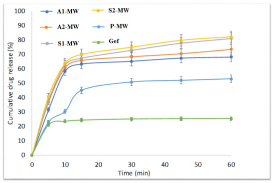 The in vitro drug release profile of Gef from different SDs prepared using microwave method are presented in Figure 10. The prepared SDs showed significant enhancement in drug release compared to the pure Gef. The pure Gef showed poor solubility with drug release of 21.23% in 60 min study time. The prepared Gef SDs showed the release pattern of S2-MW > S1-MW > A2-MW > A1-MW > P-MW. The used hydrophilic carriers showed marked enhancement in the Gef release. The difference in the release pattern among all SDs may be due to the variation in carrier property and the used ratio. The SDs prepared with Soluplus + PEG 4000 (S2-MW) showed maximum drug release (82.1 ± 5.1%) at the given time point. Gef is a poorly water-soluble compound in its pure form. However, it is water soluble in SDs due to change in its physicochemical properties. When SDs will enter into systemic circulation, Gef will be water soluble due to the amorphous nature of the drug in SDs. Therefore, the maximum drug release from S2-MW may be due to the maximum amorphization of Gef with the used carrier in the used microwave condition. The application of the microwave gives the production of uniform heat to the sample with the same rate, which helps to give better contact between the drug and carrier. This might be the main reason for the maximum drug release from SD (S2) prepared using microwave technology.
