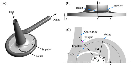 Schematic of the pump and notations. (A) Hydraulic components, (B) definition of height z in the meridian plane of impeller passage, and (C) definition of blade wrap angle θw and volute tongue angle θt in the mid-height plane of impeller passage (z/b2 = 0.5).