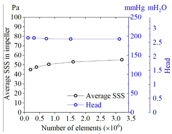 Grid independence test of model No. 4 with average scalar shear stress (SSS) and pressure head at the original design point (Q0 = 5.0 L/min, n = 2500 r/min).