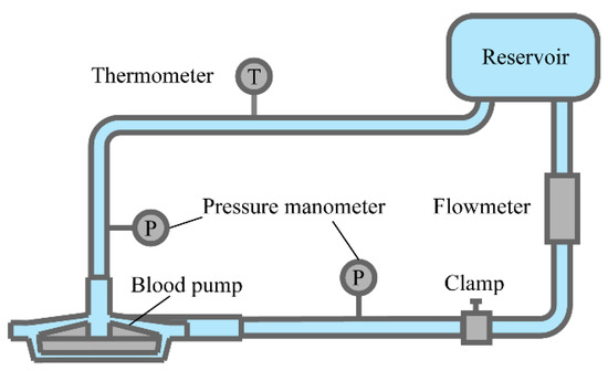 The experimental rig has been designed according to ASTM standard F1841-97, “Standard Practice for Assessment of Hemolysis in Continuous Flow Blood Pumps” [41] and consists of the test pump, a reservoir, 3/8-inch tubing, a flowmeter, and two pressure transducers as schematically shown in Figure 4. The reservoir and tubing are clinically available and the priming volume of each circuit is 400 mL. The total head and flow rate could be controlled by adjusting the resistance of a screw clamp attached to the outflow tubing and the pump rotating speed. Pressures at the pump inlet and outlet are measured with the pressure transducer (PX409S, OMEGA, Norwalk, CT, USA, 1% FS accuracy). The blood flow rate is monitored with ultrasound flowmeters (T106, Transonic Systems Inc., Ithaca, NY, USA, 3% FS accuracy). The casing and impeller of the experimental pump are chosen as the original model No. 4 and manufactured from the polymethyl-methacrylate with 3D printing and turning lathe.