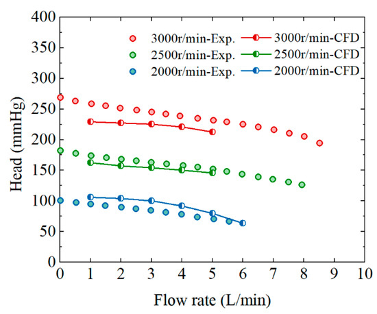 Due to the limitation of experimental conditions, a glycerol aqueous solution is used to validate the computational results of hydraulic performance. In this experiment, 37 wt% glycerol–water solution is employed as the working fluid to simulate the blood properties at room temperature (20 °C). The density and viscosity of the glycerol–water solution are 1060 kg/m3 and viscosity is 0.0035 Pa·s and each corresponds to the CFD simulation settings. The simulation results of the model No. 4 have been validated against the experimental results of pressure-flow curves.
