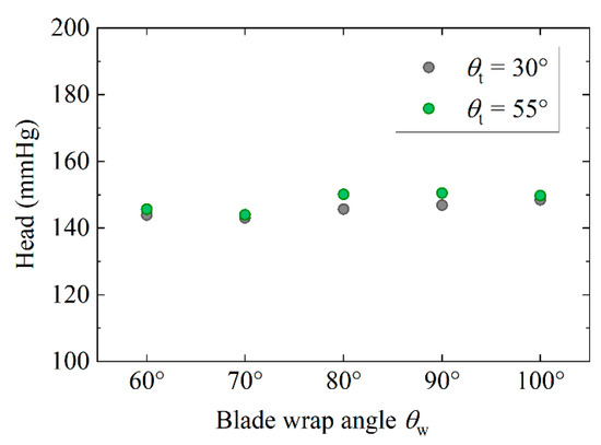 Numerical simulations on the 10 test pumps (No. 1–10) are performed at the original design point of Q0 = 5.0 L/min and n = 2500 r/min to study their pressure head difference, as shown in Figure 6 and Table 3. At this condition, the heads of the 10 pumps are all higher than 140 mmHg, indicating that they all meet the optimization objective in terms of hydraulic performance. In addition, results show that the heads of models No. 5–10 with larger wrap angles are greater than the original model No. 4 with a maximum difference of 4.2%. This shows that the larger blade-wrap-angle has a positive influence on the hydraulic performance of the centrifugal blood pump. The head of the pumps with θt = 55° is higher than that with θt = 30°. Thus, θt = 55° could be recognized as an optimal setting angle of the tongue to maximize the head at the design point of our centrifugal blood pumps.