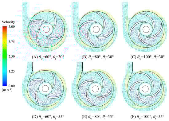 Velocity vectors in the mid-height plane of impeller passage (z/b2 = 0.5) of different blade impellers and volutes at the original design point by CFD simulation (Q0 = 5.0 L/min, n = 2500 r/min).