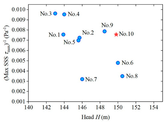 In this sub-section, the scalar shear stress (SSS) value as an essential optimum goal for 10 pumps at the design point is evaluated by CFD simulation, as shown in Table 3 and Figure 8. As shown in Figure 8, the optimization design is located in the large value area of two coordinates H and 1/τ.