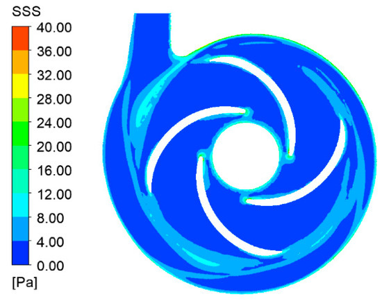 Simulated distribution of scalar shear stress (SSS) on the mid-height plane of test pump No. 10 at the original design point (Q0 = 5.0 L/min, n = 2500 r/min).