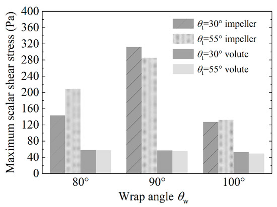 In order to further analyze the factors that influence the maximum SSS, we show the maximum SSS value in the impeller and the volute domain of six test pumps (No. 5–10) in Figure 10. The maximum SSS around the volute domain of all six test pumps are relatively low compared with the impeller domain and the maximum values are all below 60 Pa. Compared with the volute domain, the impeller domain is shown to have a higher potential for stress-induced blood damage. For instance, blood in the impeller of θw = 90° suffers from a high SSS (approximately 313 and 285.7 Pa in models No. 7 and 8, respectively). For θw = 100°, the SSS in the impeller domain is reduced to a much lower value (approximately 127.1 and 132.2 Pa in models No. 9 and 10, respectively). Hence, the desired decrease in SSS value is achieved. Moreover, the results show that the two tongue angles in this optimization have a limited effect on the SSS distribution.