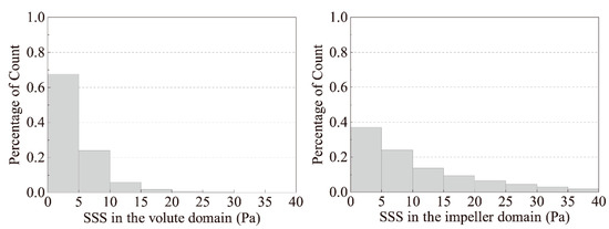 The probability distributions of the SSS in the volute and impeller regions of the test model No. 10 are shown in Figure 11. The maximum SSS in the volute domain is relatively small and 91% is below 10 Pa. On the other hand, only 60% of the SSS is below 10 Pa in the impeller region. In the impeller region, the overall SSS is slightly larger than the volute domain. Since the small SSS does not contribute much to hemolysis, it is reasonable to choose the maximum SSS as the optimization goal, which confirms our hypothesis in Section 2.3.