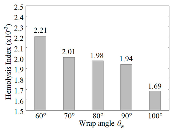 In order to further validate the methodology of the simplified optimization criteria, we also perform the hemolysis index calculation of the 5 test pumps (No. 2, 4, 6, 8, and 10) by using the Lagrangian approach. The hemolytic performances (hemolysis index) of the impellers with the same volute and the different curved blades are shown in Figure 12. The results indicate that the hemolysis index (HI) of the models with large-curved blades is lower than small-curved blades. Specifically, the HI is reduced by 23.5% as the wrap angle increases from 60° to 100°.