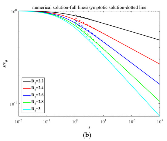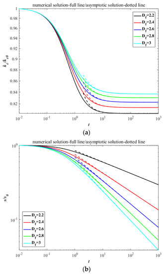 For simplification and without loss of generality, the calculation can be non-dimensionalized through the following relations: M0 * = M0 /M00, M1 * = M1/M10, M2 * = MC0M2/M20, , ke * = ke/(M00kbT), . Then the Equation (7) coupling with Equations (15) and (19) can be solved numerically by means of fourth-order Runge–Kutta method with the initial dimensionless conditions set as M00 = 1, M10 = 1, M20 = 4/3, ke0 = 1/2 (the star symbol ‘*’ is omitted thereafter). The numerical and asymptotic solutions of kinetic energy and surface area are shown in Figure 2. According to the principle of equipartition of energy, the agglomerates share the molecular thermal motion of the fluid and have the same initial kinetic energy, thus the dissipative rate of ke strongly depends on the collision rate. The evolutions of kinetic energy with time show the larger descent at lower fractal dimension because of the larger collision radius, which result in a more rapid agglomerated rate [22]. Oppositely, the contacting surface between primary particles in an agglomerate with smaller fractal dimension is less than that in an agglomerate with larger fractal dimension, thus the decay of surface area shows the reverse trend in the dual role of the higher specific surface area and more rapid agglomerated rate.