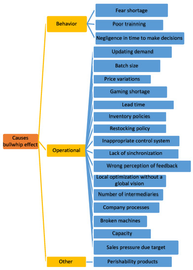 The bullwhip effect review references [2] and his postulate on the causes of the bullwhip effect. This classification complete with the characterization of the bullwhip effect proposed by [3], which involves behavioral and operational reasons. Ref. [26] makes contributions such as the breakdown of machinery and the number of intermediaries as other operational causes. [7] proposes a new cause such as the level of deterioration of the product, found in “other causes”—the structure of the bullwhip effect’s causes shown in Figure 2.