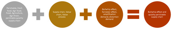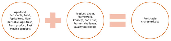 In the case of perishable products, the search focused on the factors that affect the perishable supply chain’s quality. There are several definitions of perishable products, ref. [20] establishes as any processed or semi-processed substance that is useful for human consumption; however other authors such as ref. [21] adds that they must be of short duration. Figure 3 establishes the search equation for the characteristics of the perishables supply chain.