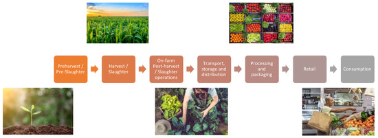 FAO establishes a supply chain that starts from the processes that occur in the Farm, that is, Agricultural production, then Post-harvest handling & storage, Processing, Distribution, and Consumption [44]. Figure 4 shows the structure of the supply chain for perishable products proposed for this research.