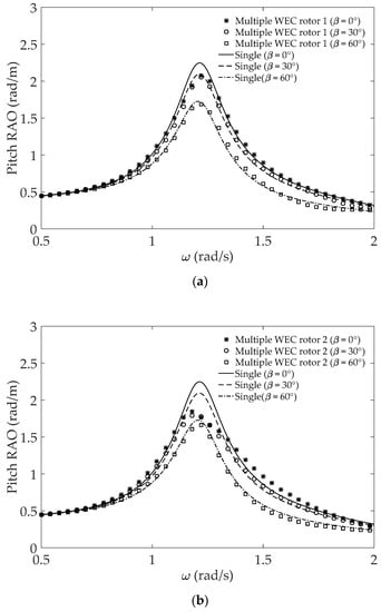 Figure 7 shows the pitch RAO of multiple WEC rotors by changing wave frequencies from 0.5 rad/s to 2.0 rad/s with an increment of 0.02 rad/s for different wave-heading angles β = 0°, 30°, and 60°. Line denotes the isolated WEC rotor and symbols represent multiple WEC rotors. The viscous damping is 25.0 kN⋅m⋅s/rad (see [31]). The spacing between rotors was tested for 10 m, which is the center-to-center distance. Notably, the pitch RAO of isolated and multiple WEC rotors predicts a similar hydrodynamic behavior with a range of wave frequencies. The isolated WEC rotor at a small wave-heading angle predicts increased RAO within the range of frequencies considered, while peak amplitudes are slightly affected in the case of multiple WEC rotors. Peak pitch RAO variations according to the wave frequency and wave-heading angle were observed, and the main resonance frequency was within the range of 1.2–1.23 rad/s (see Table 2). The influence of PTO damping on the WEC RAO is illustrated in Figure 8. Equation (3) shows that the estimated minimum PTO damping of the WEC rotor is 34.6 kN⋅m⋅s/rad. Figure 8 clearly shows the maximum reduction focused around the peak frequency although the influence is in-significance as moving away from the peak. The PTO damping has a strong influence on peak frequencies at all wave-heading angles (see Table 2). Figure 9 shows the variation of the q-factor (given by Equation (6)) as a function of the wave-heading angle and frequency for with and without PTO damping. Interaction effects are constructive (see the dark red contour in Figure 9) within the range of (0.5 < ω < 1.08 and β ≤ 60°) and (1.34 < ω < 1.82 and β < 30°) for without PTO and (0.52 < ω < 1.1 and β ≤ 60°) and (1.33 < ω < 1.77 and β < 30°) for with PTO but destructive otherwise.