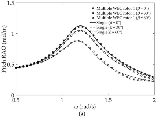 Pitch RAO (rad/m) of isolated and multiple WEC rotors with PTO as a function of the wave frequency (rad/s). Comparison of the isolated WEC rotor and multiple WEC rotors (a) 1, (b) 2, and (c) 3.