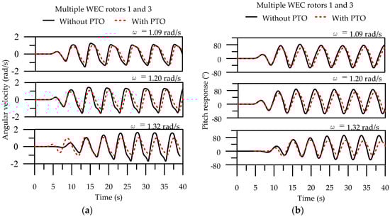 Numerical comparison of isolated WEC rotor with and without PTO for different wave frequencies: (a) angular velocity and (b) pitch response.