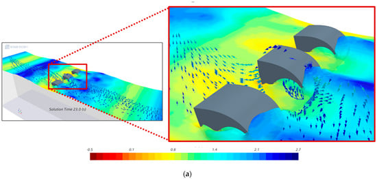 Table 3 presents the pitch RAO and q-factor comparison between the linear BEM and nonlinear CFD results. The pitch RAO of wave frequencies (1.02, 1.20, and 1.32 rad/s) without PTO shows the satisfactory overall consistency between the linear BEM and nonlinear CFD solutions, except for the significant variation in the case of 1.20 rad/s. The linear BEM results demonstrate higher destruction in the q-factor compared with the nonlinear CFD findings. The overall consistency of the pitch RAO with PTO was reasonable, whereas variations were higher than 42% when the linear BEM and nonlinear CFD results were compared at 1.32 rad/s. The variation of the q-factor was high at the wave frequency of 1.20 rad/s. The free surface wave profile colored by the vertical water particle displacement in the NWT is shown in Figure 12. Large differences in the free surface wave elevation at the rear and front sides of rotors, phase lag among rotors, and the interaction of radiated waves allow for a rigorous mixing of the flow at the center of rotation (see Figure 12). The WEC rotor 2 demonstrated stronger and more distinct mixing than WEC rotors 1 and 3. The violent liquid motion resulted in large slamming forces and significant changes without PTO at ω = 1.20 rad/s and with PTO at 1.32 rad/s compared with other cases. However, compared with the nonlinear CFD, the linear BEM results typically led to the overestimation of findings in most of the tested cases because the violent interaction is neglected.